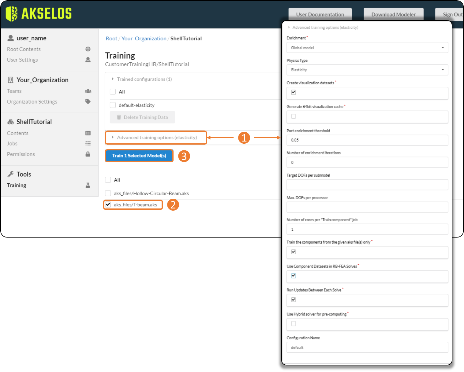 - Expand Advanced training options (elasticity) → Select these options as in the figure below → Tick on the model (T-beam.aks) → Click on the Train 1 Selected Model(s) button.