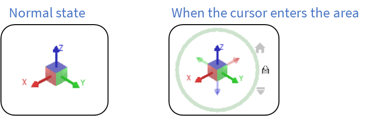 - Triad: It is a set of three colored axes in red, green, and blue extending from a center cube. These colored axes are aligned with the x, y, and z axes of the model world coordinate system. Three axes and sides of the center cube are clickable. Users can orient the scene view by clicking on them. When the cursor hovers over any of them, its color will darken to indicate that interaction is possible.