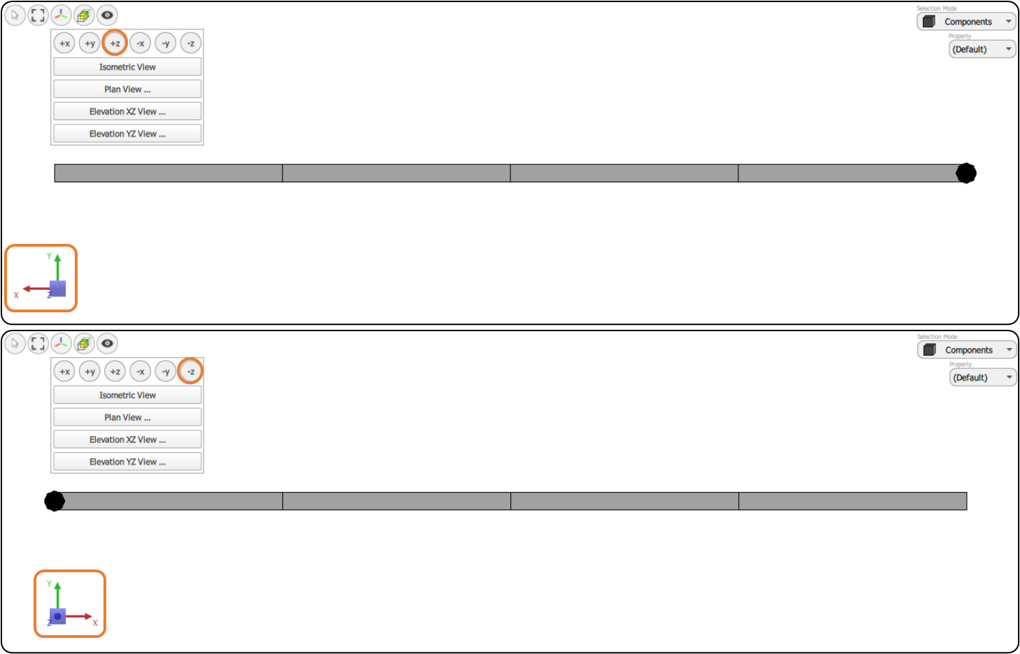 - Axis Label: Axis labels (X, Y, and Z) are always ahead of the axis tips. Besides rotating about the Triad origin (when users re-orient the scene view or drag the rotation wheel), the labels can also rotate about their centroid to always keep them vertical.