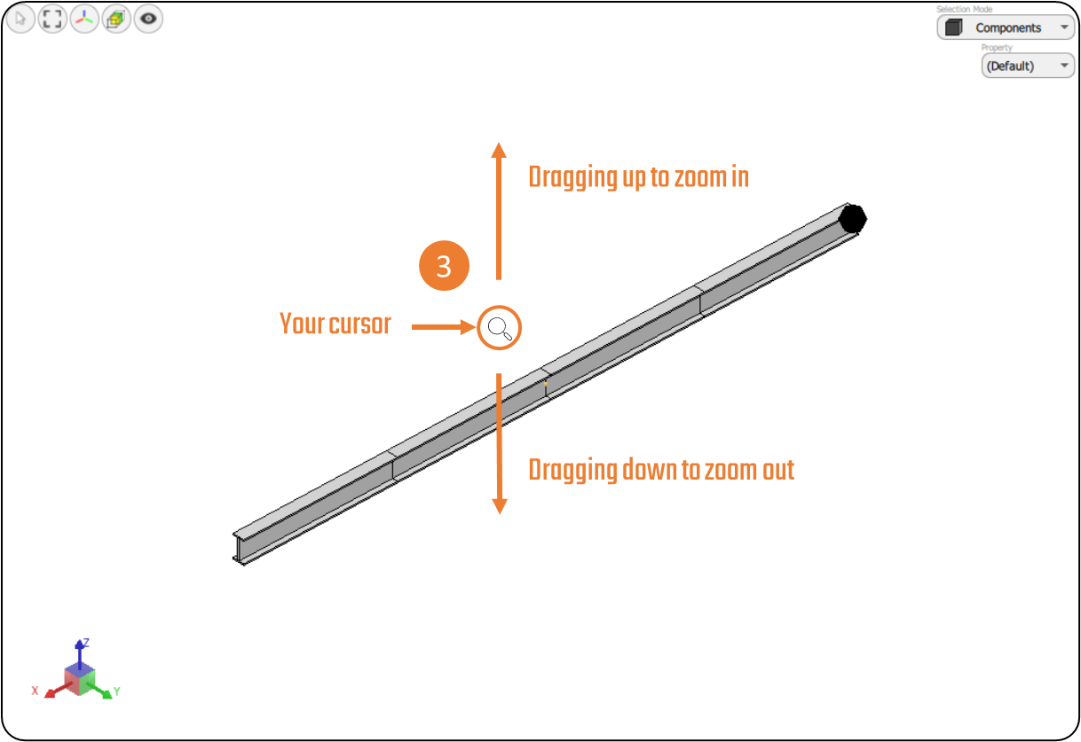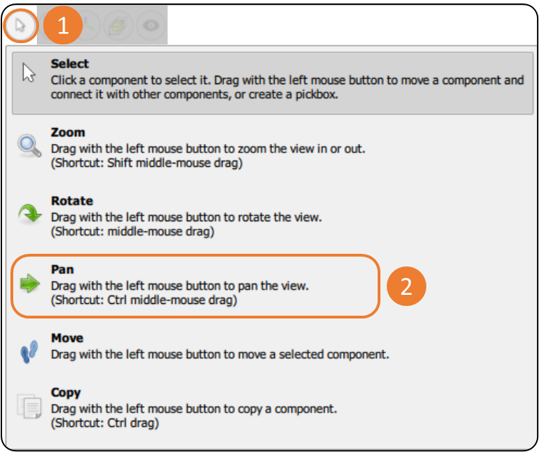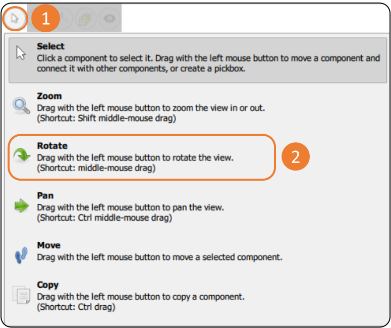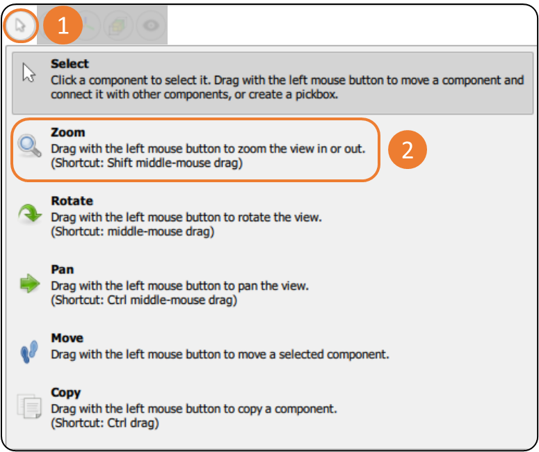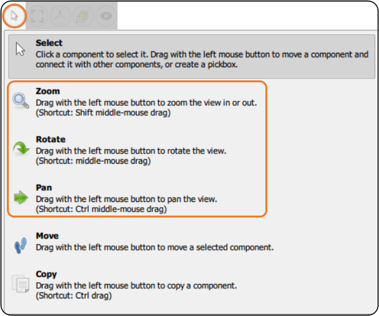 The Drag Action group contains tools that change the functionality of the left mouse cursor to allow users to orient components or the model view. There are three tools that support orienting the view: Zoom - Rotate - Pan.