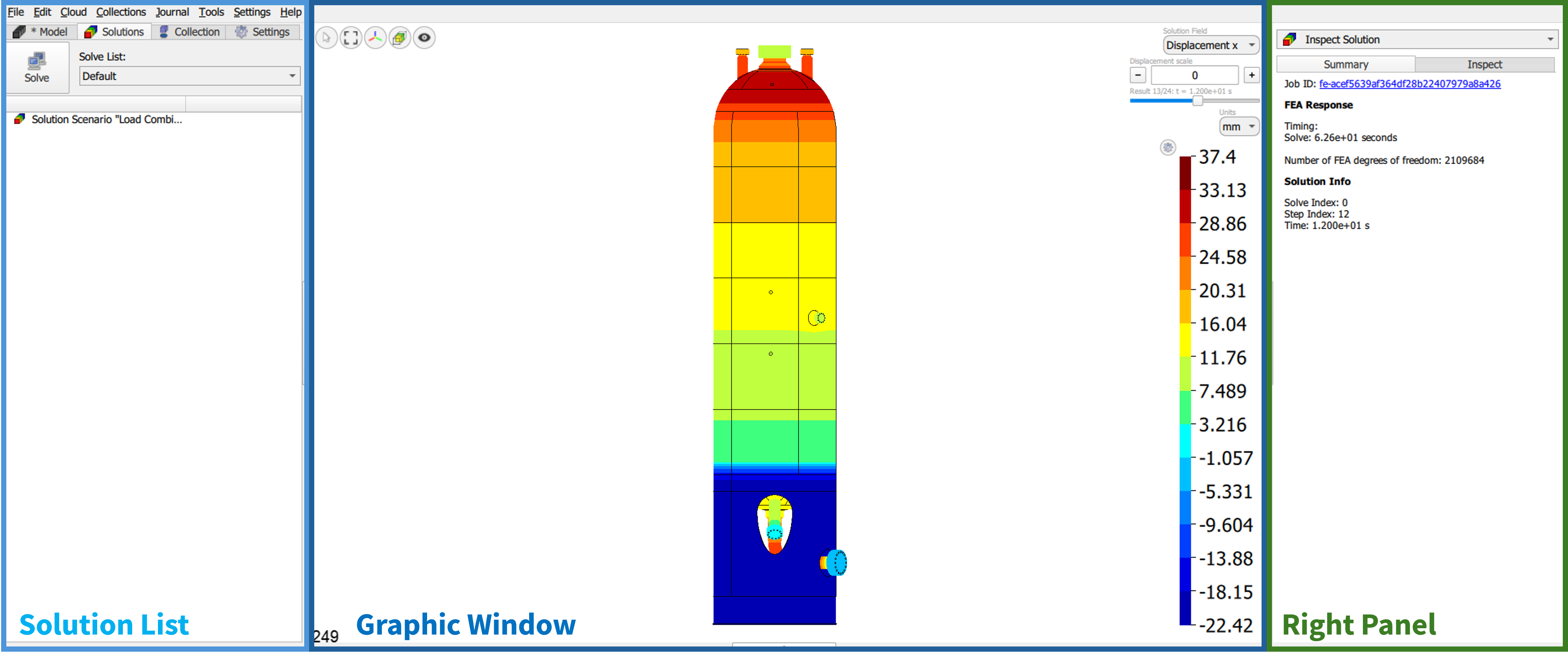 Now, navigate to the Solution tab to initiate a Solve Request, but first recheck that the correct Solve List and Solve Scenario is selected. Click the Solve button on the left panel, this will send a Solve Request to Akselos Cloud with the current parameters setup and begin the solving process.