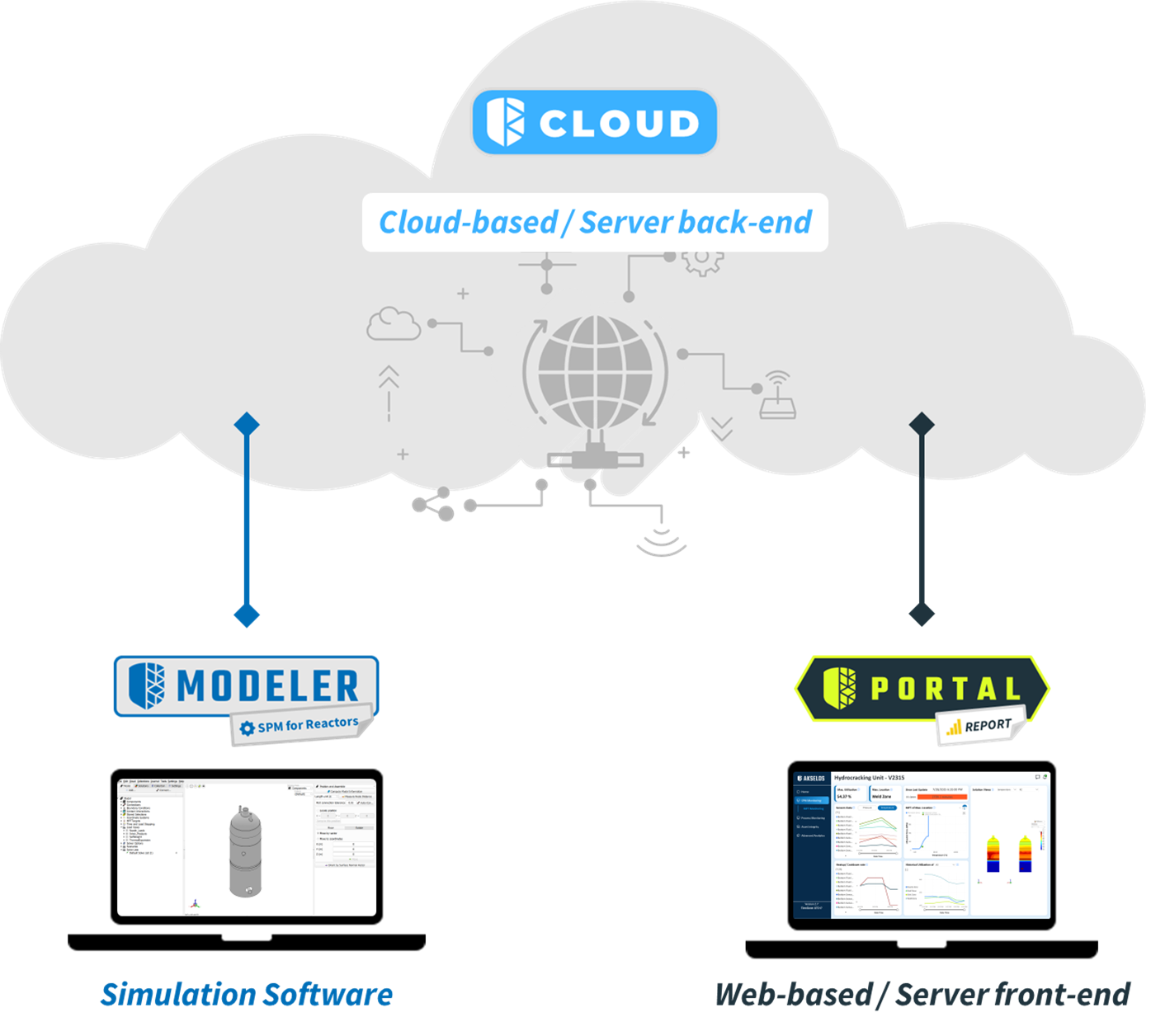 Once the model is built in Modeler, it is synced to the Cloud for solving. The Portal manages these synced collections and jobs, while the final results are returned to the Modeler for visualization or accessed through the Portal for review and documentation.