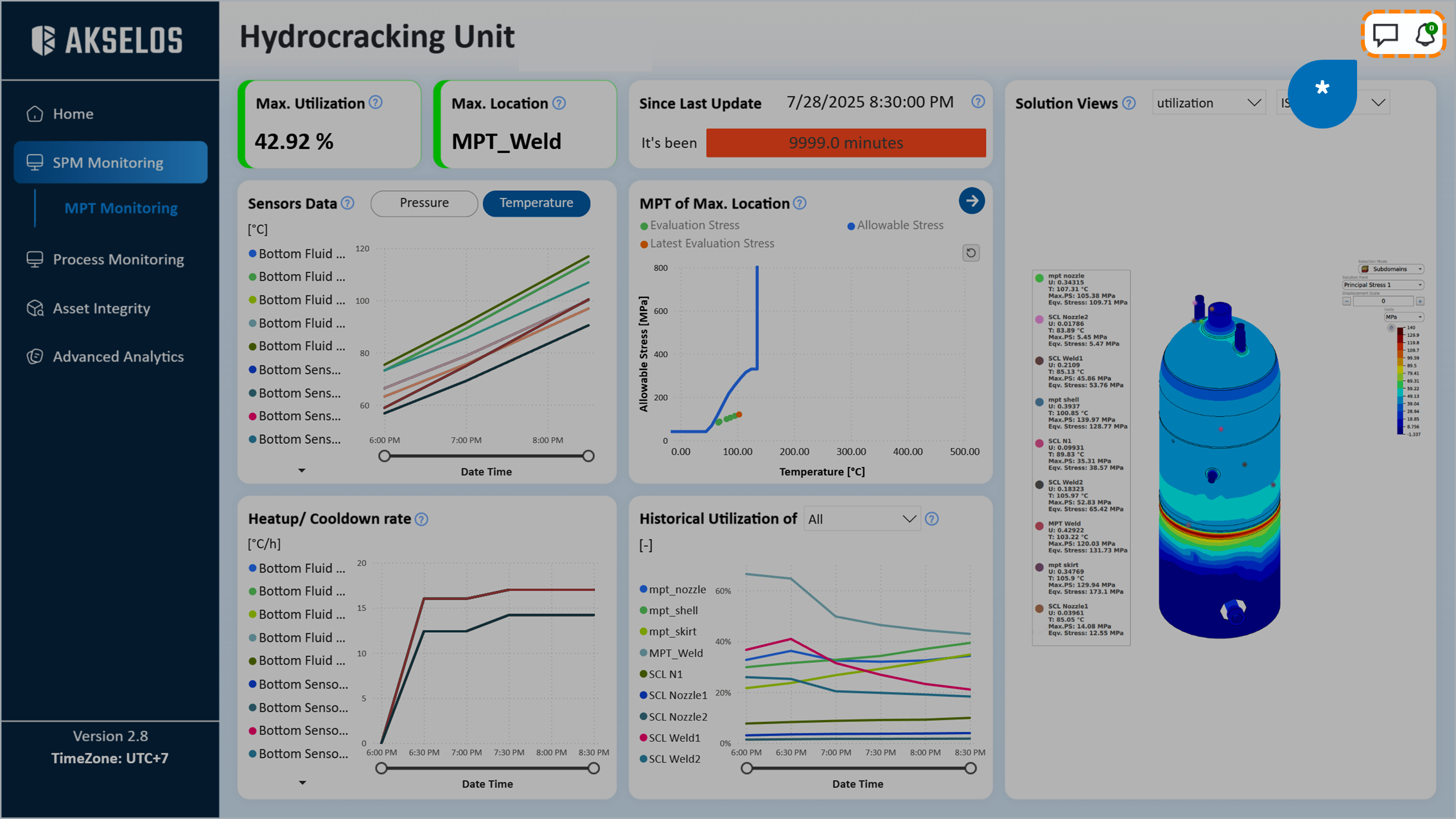 The Akselos MPT Dashboard is the last stage of the Structural Performance Management (SPM) workflow. It transforms complex engineering data into a clear, interactive interface, enabling real-time monitoring and proactive decision-making to ensure the safe and efficient operation of reactor assets.