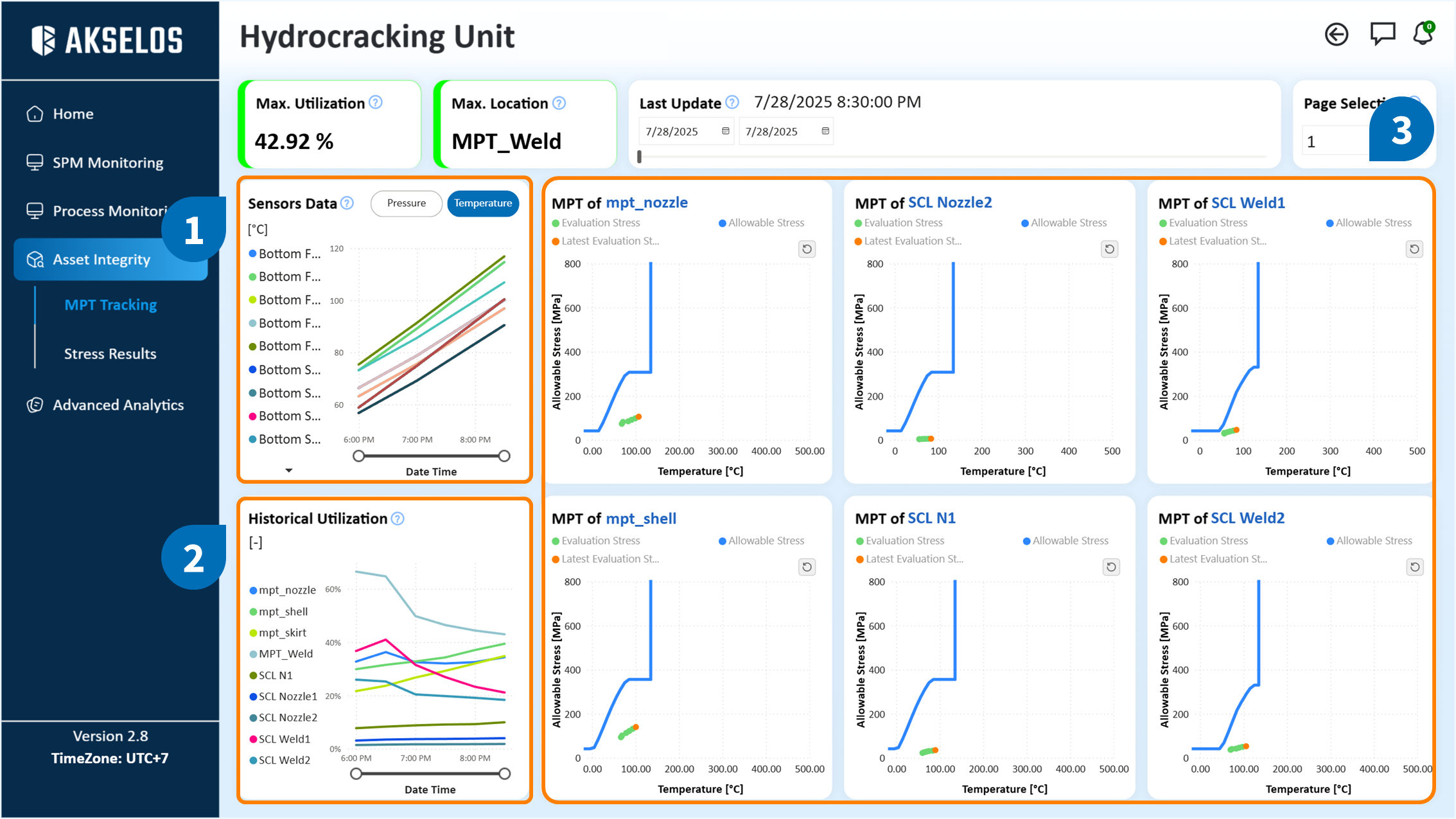 2. Historical Utilization: This time-series chart tracks the Utilization Factor of each MPT location throughout the selected time range. It is useful for identifying how utilization changes across operating cycles and validating whether stress levels recorded in previous MPT charts align with sensor and process conditions.