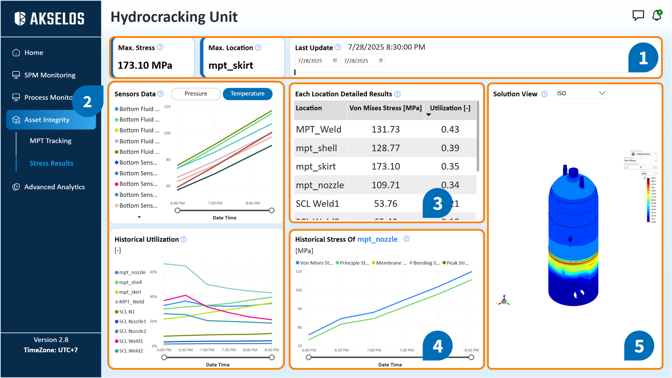 5. Solution View: Solution View: An static model that visually maps the stress distribution across the entire asset, with a color legend to quantify stress levels and identify hotspots.