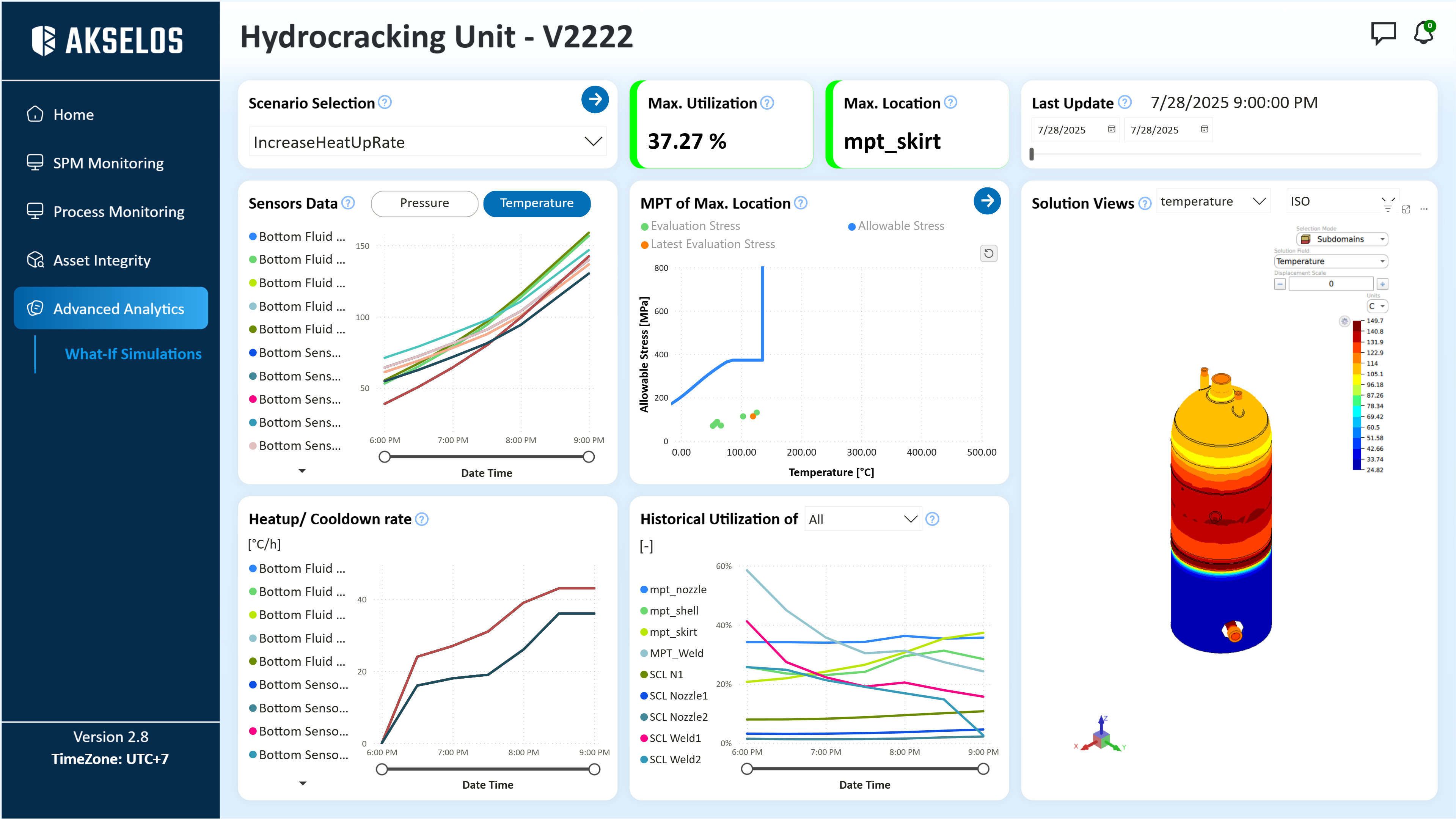 2. Sensors Data: This chart plots real-time temperature and pressure readings streamed directly from the sensors installed on the asset and stored in the Akselos database. While this data serves as a critical input for the simulation model to perform the MPT assessment and to calculate the heat-up/cooldown rate, its purpose on the dashboard is also for direct operational monitoring. Displaying the raw sensor data allows operators to visually track live conditions, verify data integrity against the plant's control system.
